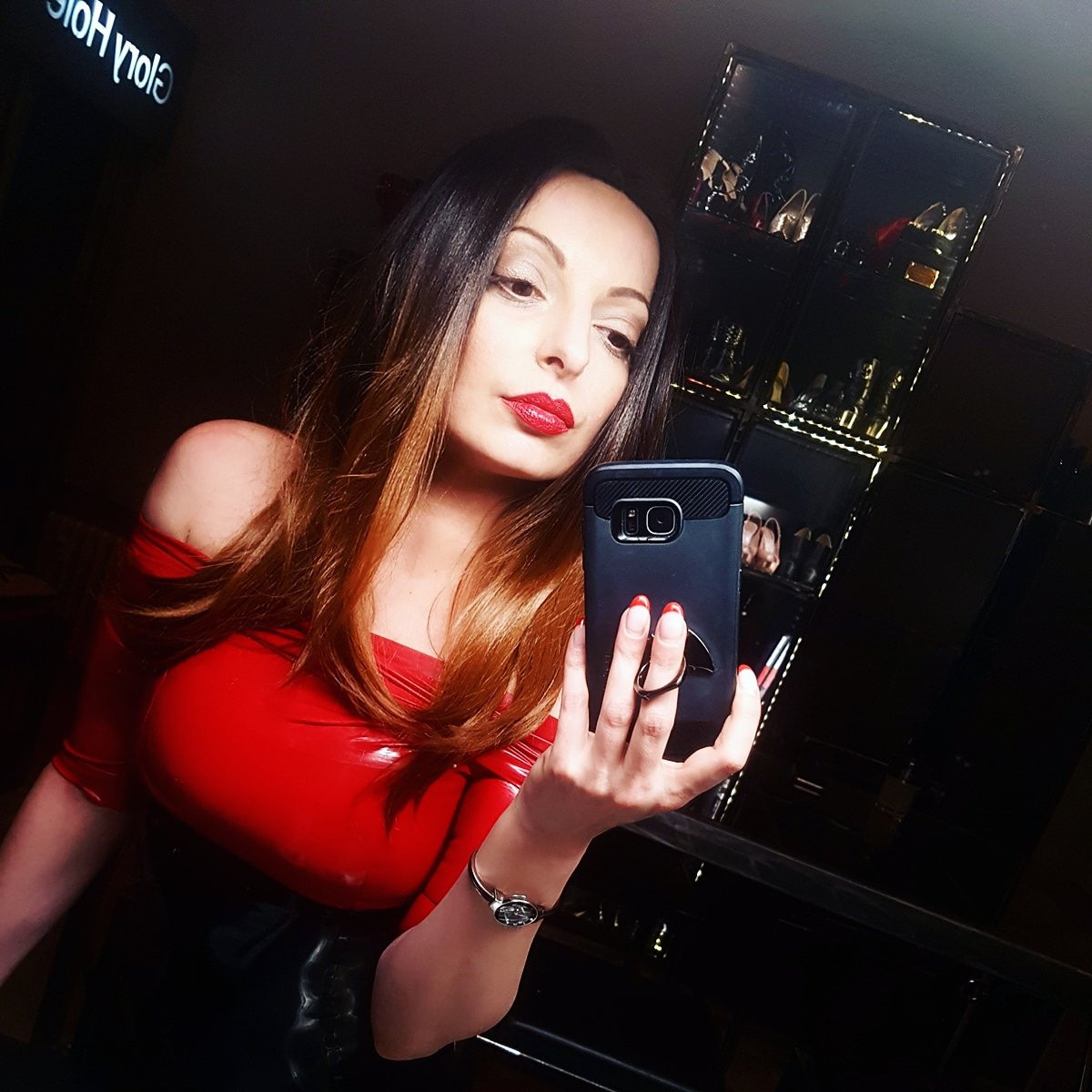 Anna Rosenmüller schwarzes Latexcatsuit schön geschminkt und geiler Lippenstift. Bild von wichsenden
